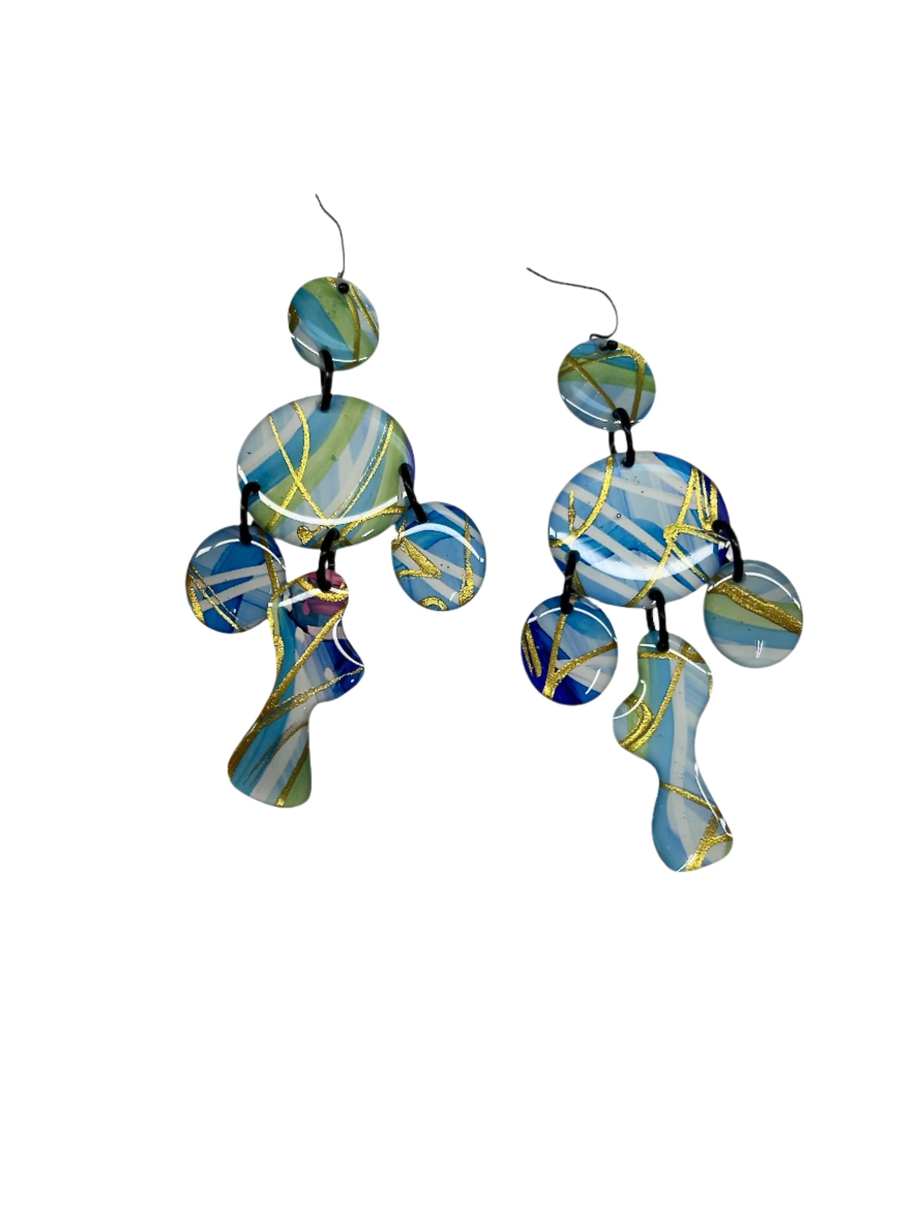 Big Earrings. Hand made, irregular, smooth, glossy white base earrings. The design and pigments may vary from photo. One of a kind. Design in front and back of earring making it reversible. Aprox. 3"