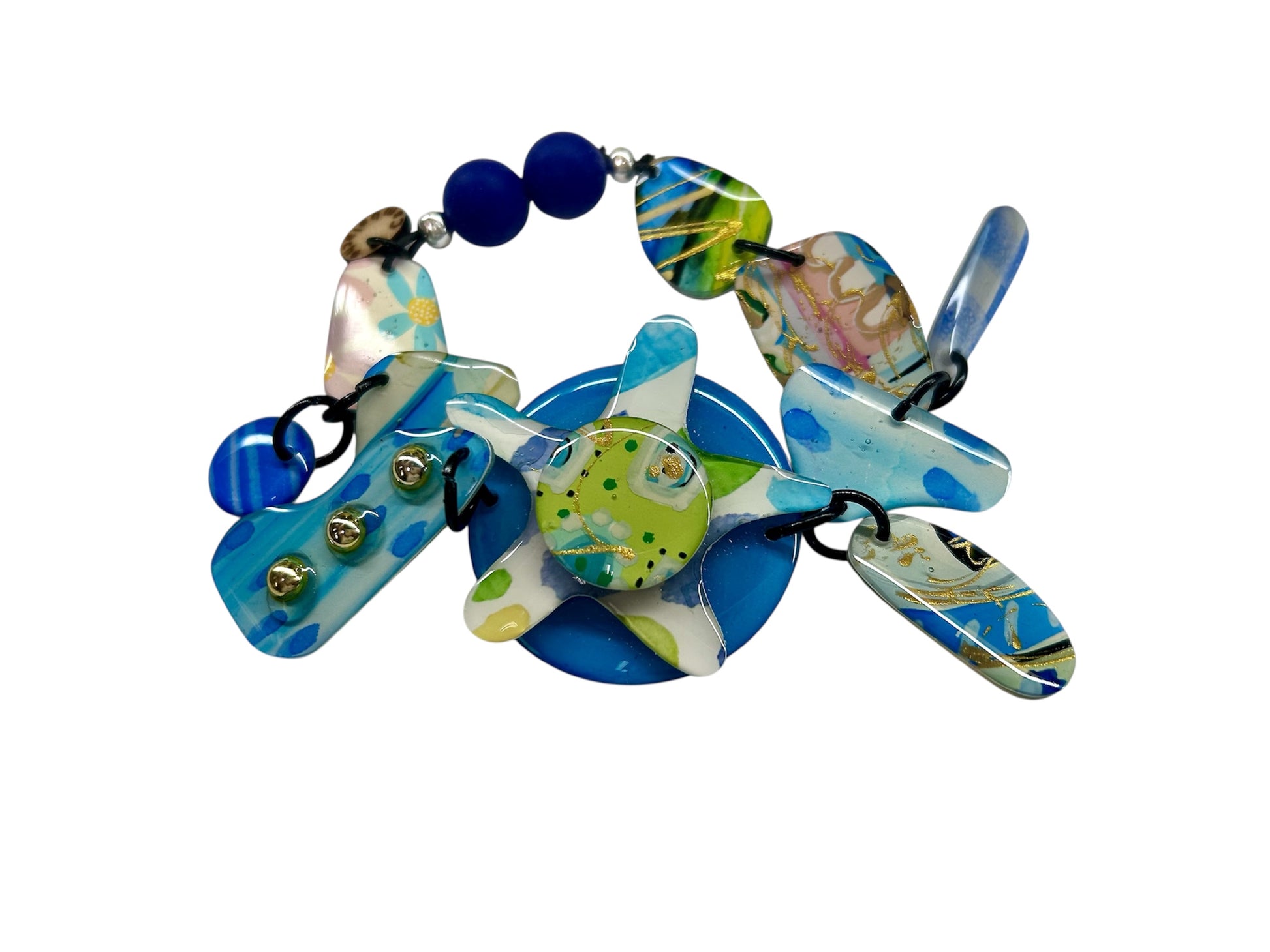 This multi-colored bracelet is crafted from lightweight resin, hand-painted to create a unique, one-of-a-kind design. The stretchable back ensures a comfortable fit for most, while the waterproof feature adds a touch of fun to this piece of wearable art.